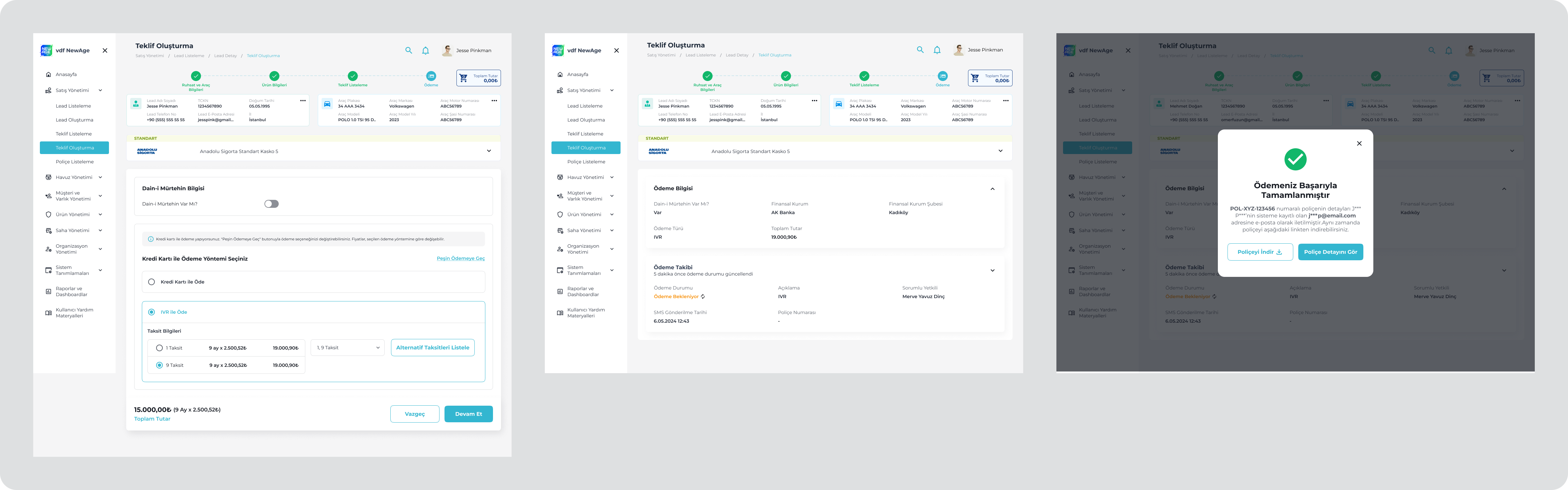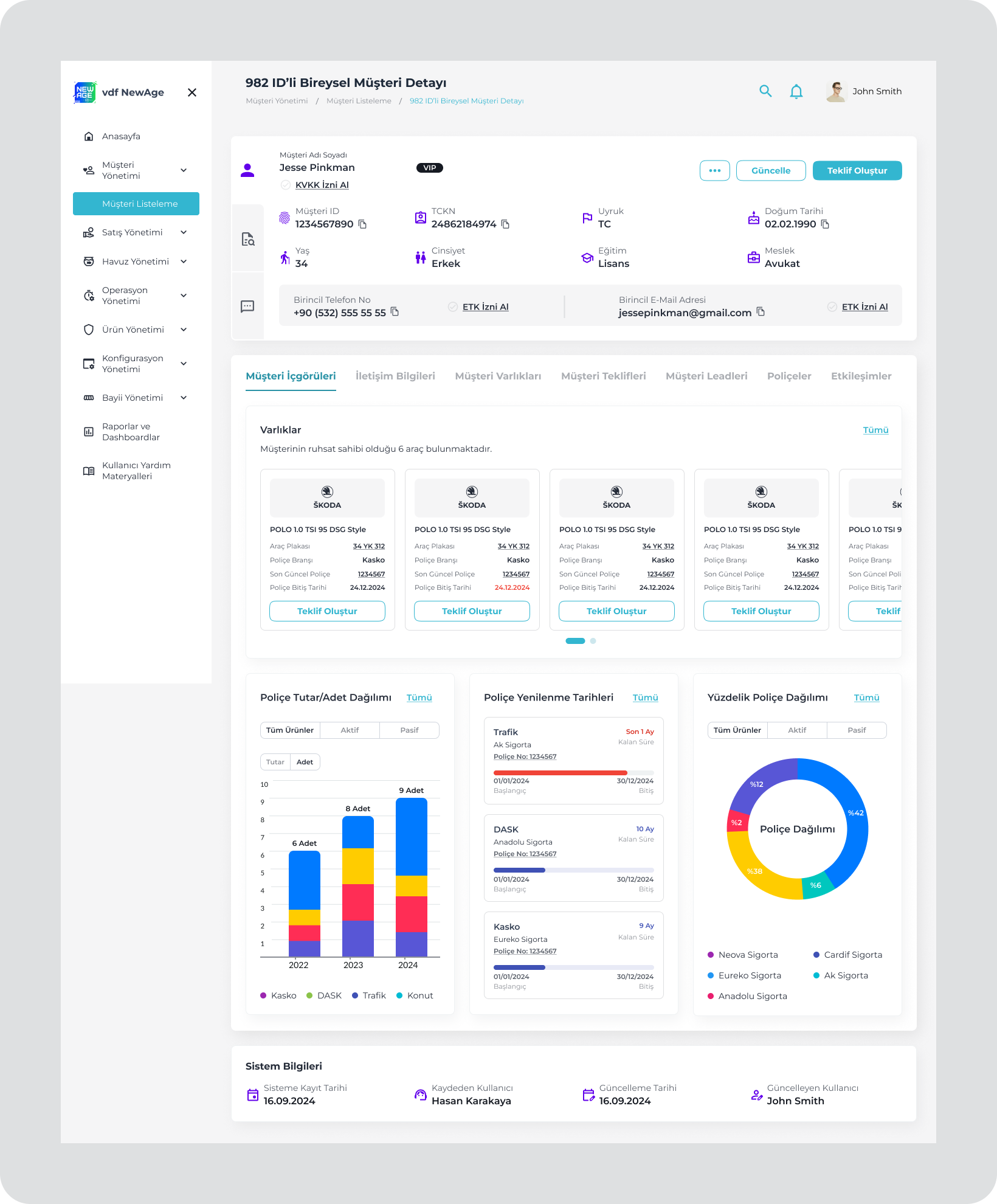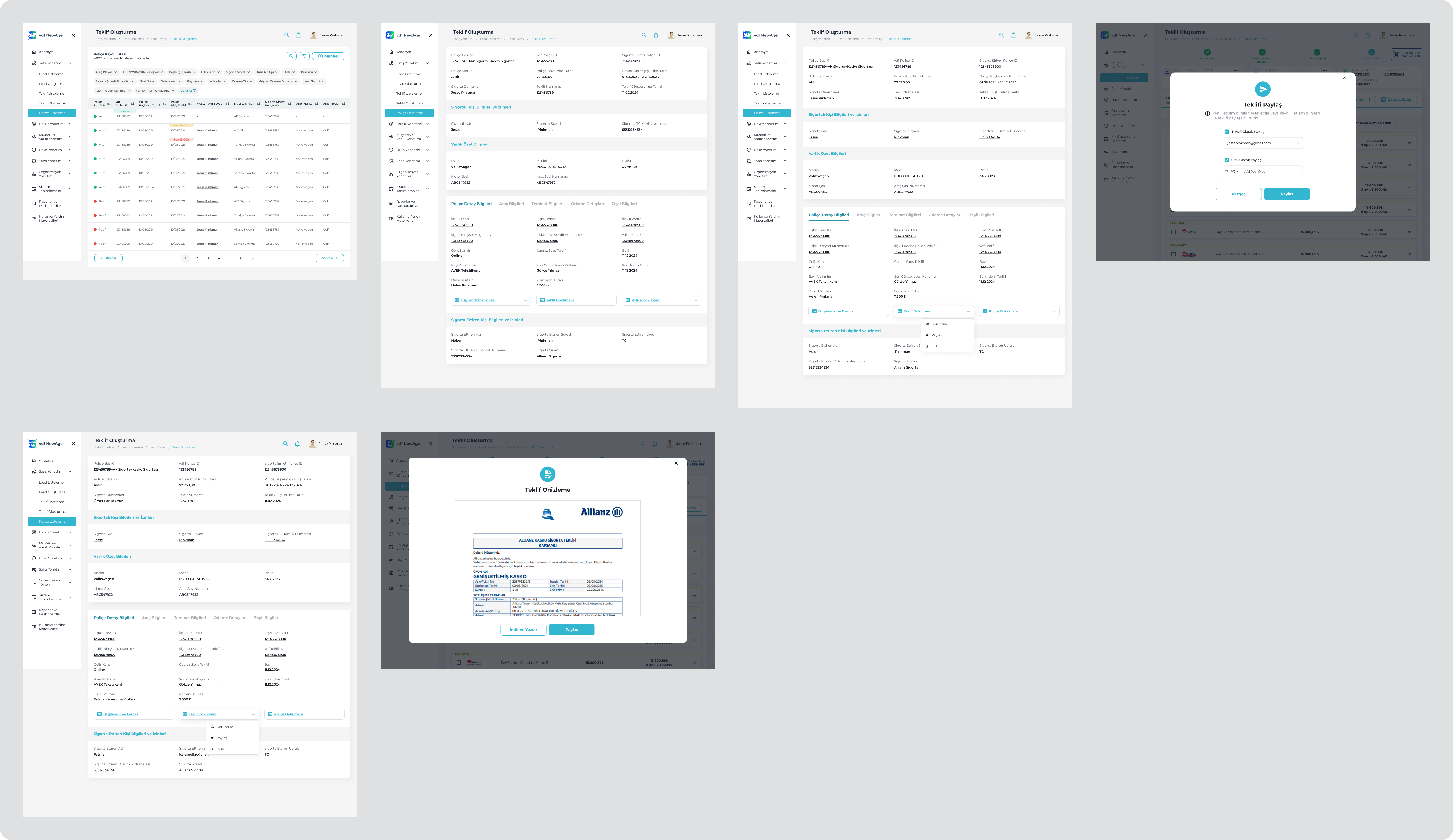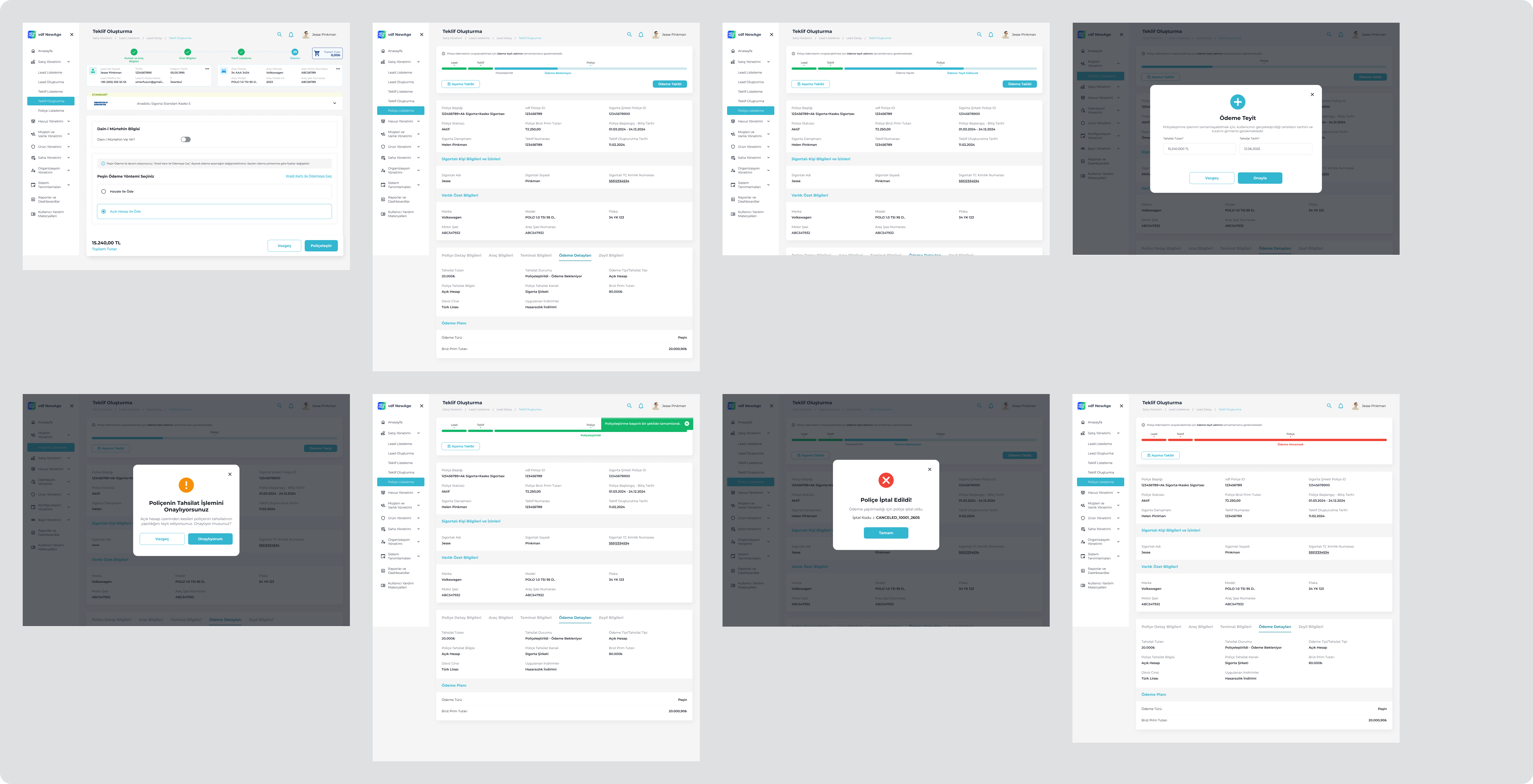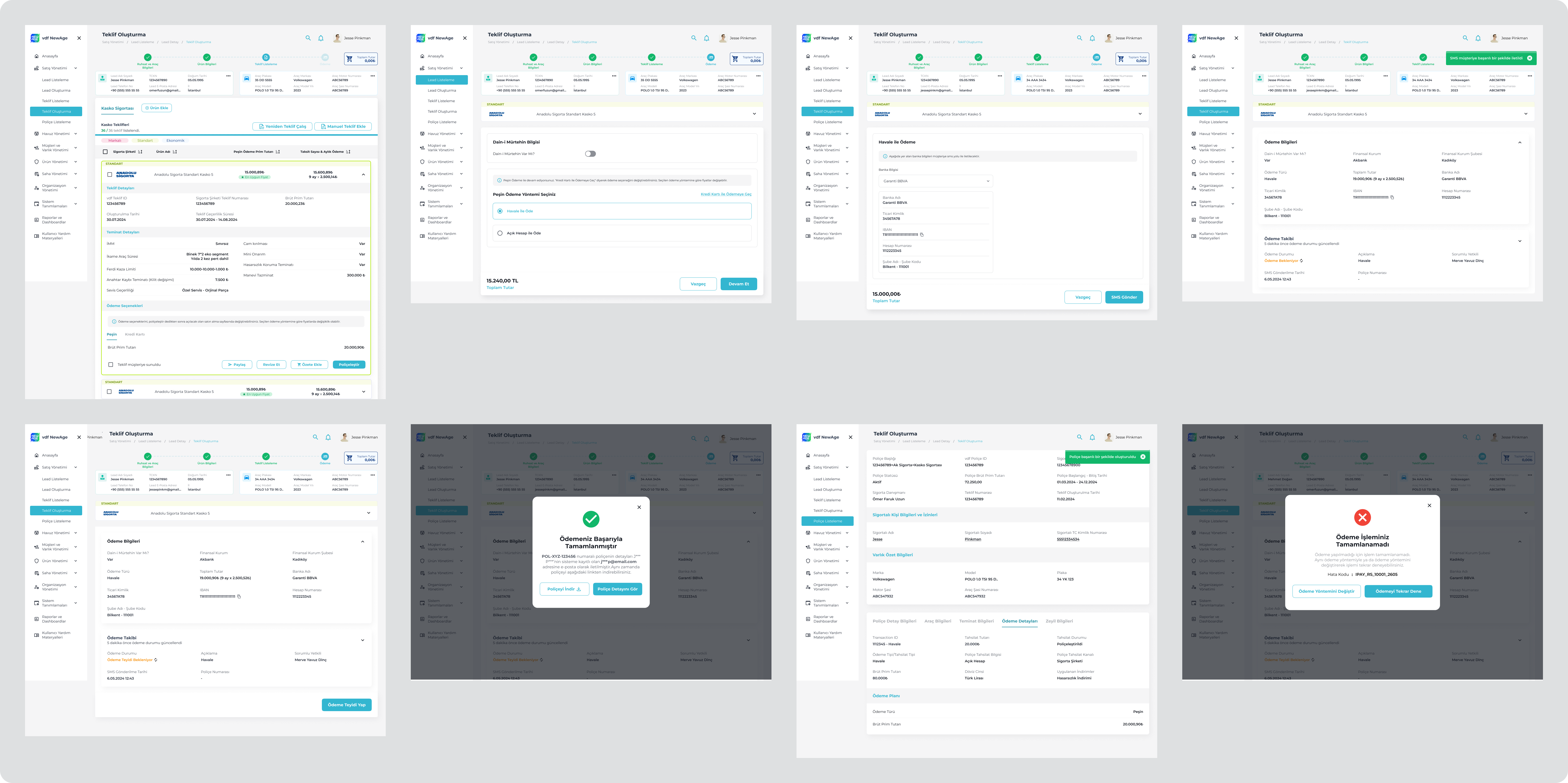 VDF NewAge is an internal B2B insurance platform used by Volkswagen Dogus Finans sales and operations teams. The system supports complex insurance processes under regulatory constraints, covering customer management, policy creation, payments, and operational tracking.